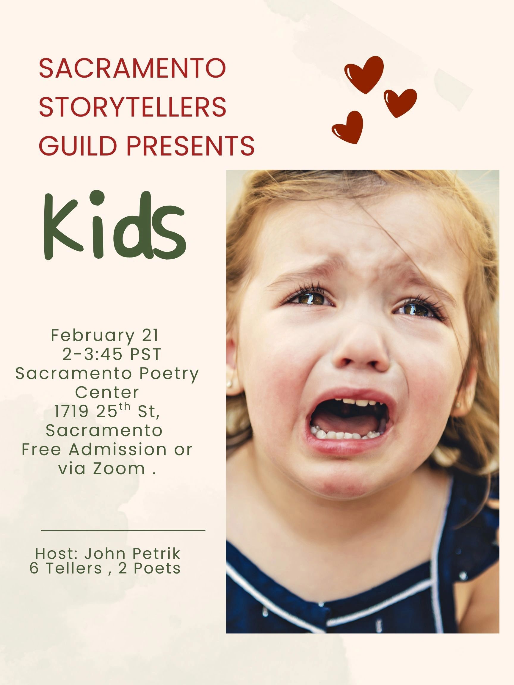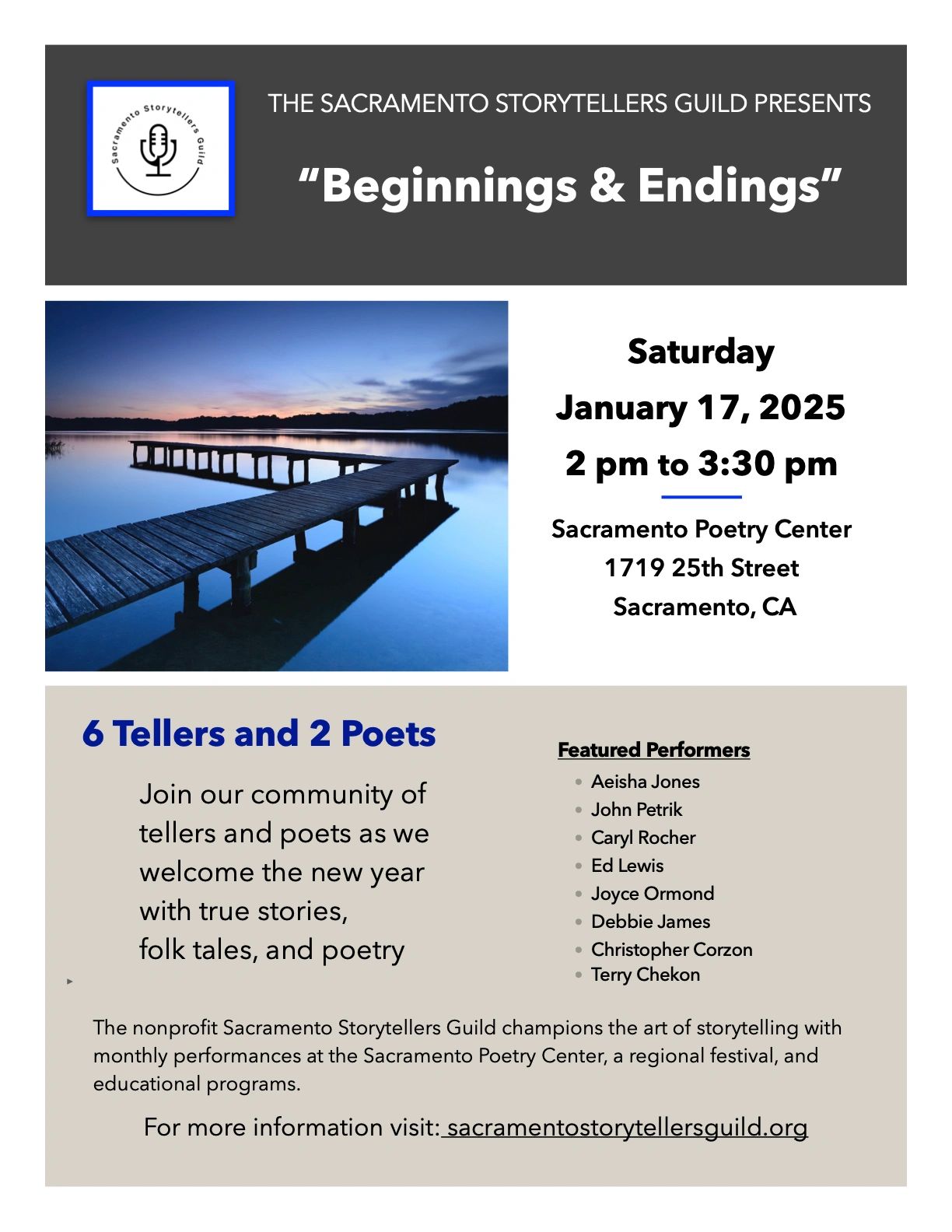 Better yet, see us in person on the third Saturday of every month (except for March 15, 2025 which is our Storytelling Festival held in West Sacramento) at the Sacramento Poetry Center, 1719 25th Street, Sacramento, CA, from 2:00 - 3:45 PM for our monthly storytelling performance.