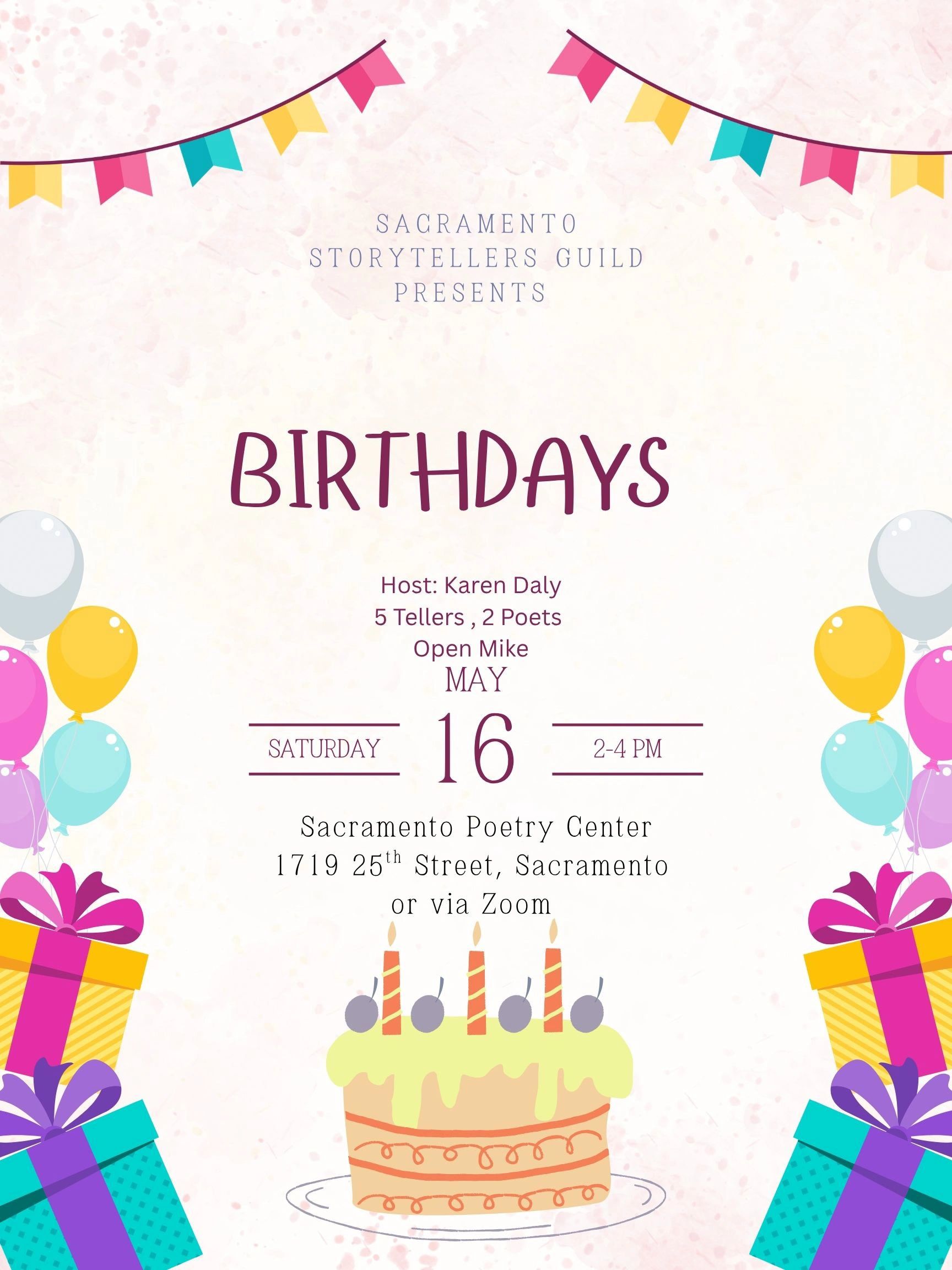 The Sacramento Storytellers Guild (SSG) a nonprofit organization, holds storytelling events on the third Saturday of the month except in March. Join us at the Sacramento Poetry Center, 1719 25th Street, in Sacramento or via Zoom from 2:00 to 3:45 PM . Zoom registration required- Click Banner at top of page . Other Sac Area Storytelling Events also listed.